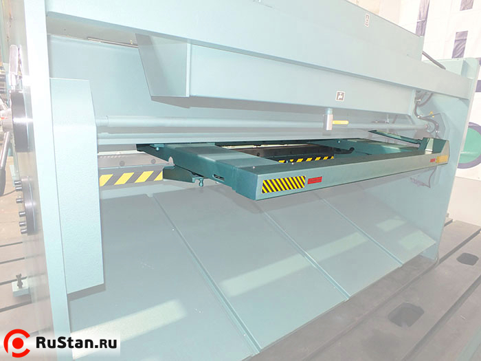 Цилиндры через цапфы установлены в кронштейнах, которые жестко крепятся на траверсе станины. Ножевая балка двигается вертикально в направляющих, закрепленных на стойках станины. В собственных направляющих перемещается прижимная балка. Прижимная балка прижимает заготовку к столу с помощью плунжерных гидроцилиндров, которые передают усилие от стоек к балке. Подъем прижимной балки осуществляется ножевой балкой при обратном ходе. На балке ножевой закреплен упор задний, который предназначен для упора заготовки перед резкой. Перемещение упора производится при помощи маховичка, расположенного с задней стороны гильотинных ножниц.