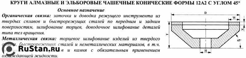 ГОСТ 16172-90 Основное назначение: заточка и доводка режущего инструмента из твердых сплавов и быстрорежущих сталей по передним и задним поверхностям, шлифование торцов, доводочное шлифование деталей типа тел вращения. 12А2-45град(чашечный конический)- круг чашечный конический формы 12А2 с углом 45 150х5х3х32 (DxWxXхH)мм-диаметр круга,ширина и толщина алмазного слоя, посадочный диаметр АС4 160/125-марка и зернистость шлифпорошка из синтетических монокристаллических алмазов 100%-концентрация В2-01-связка органическая 30,0кар-масса алмаза,карат ГОСТ16172-90Комментарии и вопросы: