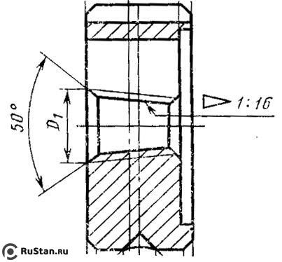 Параметры резьбы: дюймовая резьба с конусностью 1:16 (угол конуса 3°34’48"). Угол профиля при вершине 55°.