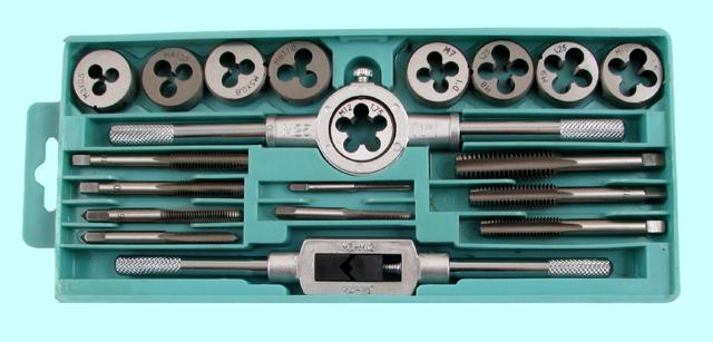 Комплектация набора: метчики однопроходные UNC: 1/4"-20ниток/дюйм, 5/16"-18ниток/дюйм, 3/8"-16ниток/дюйм, 7/16"-14ниток/дюйм, 1/2"-13ниток/дюйм; плашки круглые UNC: 1/4"-20ниток/дюйм, 5/16"-18ниток/дюйм, 3/8"-16ниток/дюйм, 7/16"-14ниток/дюйм, 1/2"-13ниток/дюйм; вороток для метчиков М3-М12 (1/16"-1/2"); плашкодержатель М25 (1")