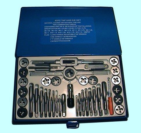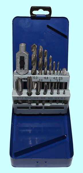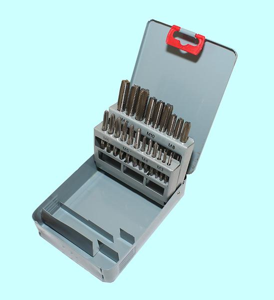 Комплектация набора: метчики однопроходные M6x1, M7x1, M8x1.25, M10x1.5, M12x1.75; плашки круглые M6x1, M7x1, M8x1.25, M10x1.5, M12x1.75; вороток для метчиков М3-М12; плашкодержатель М3-М12