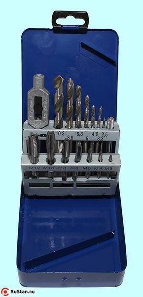 Комплектация набора: метчики однопроходные М3х0.5, М4х0.7, М5х0.8, М6х1.0, М8х1.25, М10х1.5, М12х1.75мм; сверла ц/х d2.5, d3.3, d4.2, d5.0, d6.8, d8.6, d10.3мм; вороток для метчиков М3-М12.