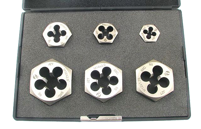 Комплектация набора: плашки шестигранные 14х2,0; 16х2,0; 18х2,5; 20х2,5; 22х2,5; 24х3,0.