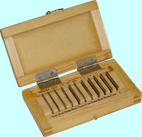 Набор предназначен для измерения мелких деталей. Измерения призводят отдельными мерами, не собирая их в блоки. Комплектация: от 0,1 до 0,29мм (через 0,01мм) - 20шт.