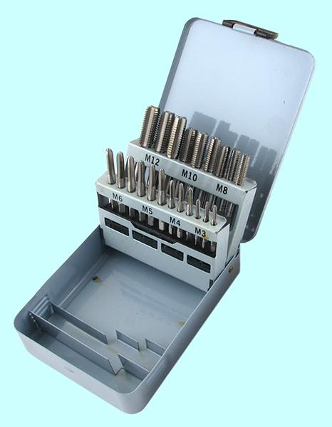Комплектация: метчики однопроходные М3х0.5, М4х0.7, М5х0.8, М6х1.0, М8х1.25, М10х1.5, М12х1.75мм; вороток для метчиков М3-М12мм (1/16"-1/2")