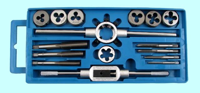 Комплектация набора: метчики однопроходные M6x1, M7x1, M8x1.25, M10x1.5, M12x1.75; плашки круглые M6x1, M7x1, M8x1.25, M10x1.5, M12x1.75; вороток для метчиков М6-М12; плашкодержатель М6-М12