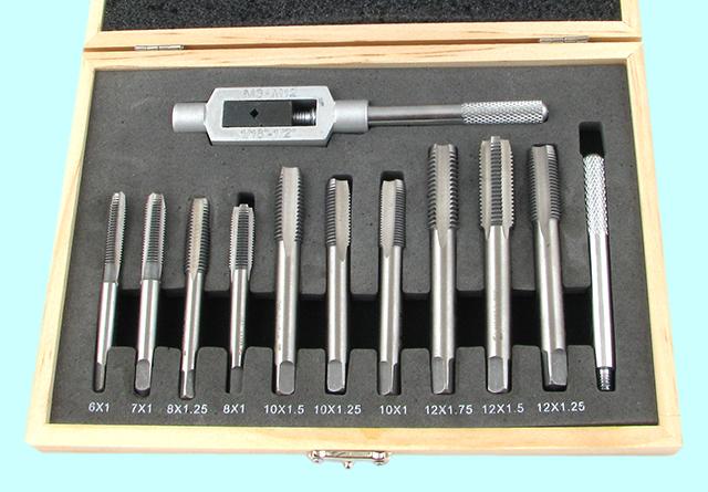 Комплектация набора: метчики однопроходные M3x0.5, M4x0.7, M5x0.8, M6x1, M8x1.25, M10x1.5, M12x1.75; плашки круглые M3x0.5, M4x0.7, M5x0.8, M6x1, M8x1.25, M10x1.5, M12x1.75; вороток для метчиков М3-М12; плашкодержатель М3-М12