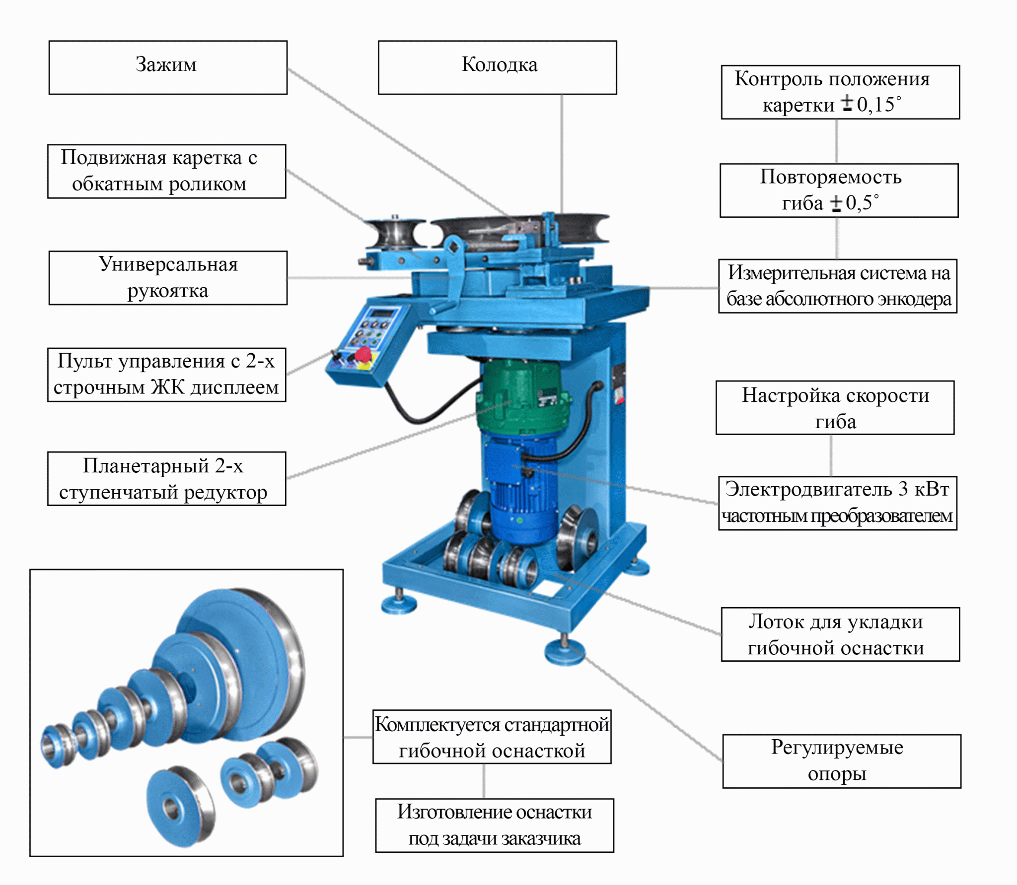 - Повторяемость гиба ± 0,5°. (За счет применения абсолютного энкодера обеспечивающего контроль положения каретки с точностью ± 0,15°).