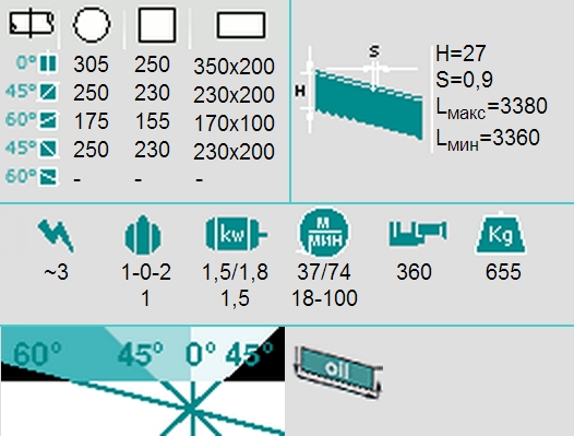 Электрическое оборудование отвечает требованиям стандартов ЕС EN60204-1, EN55011, EN50082-2, низковольтное (24 В). Главный выключатель с установкой блокировки и пружиной минимального натяжения. Тепловая и магнитная защита двигателя от перегрузки, торцевые наконечники на защитном ограждении ленты и натяжителе ленты. Напольная стойка предназначенная для перемещения с помощью электропогрузчика. Электронная панель управления, все рабочие функции станка (включая движения пильной рамы: быстрая установка, начало резки, конец резки) программируются с панели управления, дисплей работает на светодиодах. Показывает срок службы ленты, скорость вращения ленты, общее число резов, времена циклов резки, демпфирование двигателя, автодиагностику. Регулируемые передние гидравлические тиски, которые могут двигаться в поперечном направлении по рабочей поверхности и быстрой блокировкой, основание с емкостью и насосом. Соединение с загрузочным роликовым столом с помощью опорного ролика шириной 300 мм, дополнительный подшипник для выравнивания направления ленты. Чистящая щетка для режущей ленты, регулируемая остановка заготовки, биметаллическая лента. Возможность присоединения ножной педали и/или цифровой измерительной системы (номенклатура RTD). Гаечные ключи. Руководство по эксплуатации. Техническое обслуживание и запчасти.