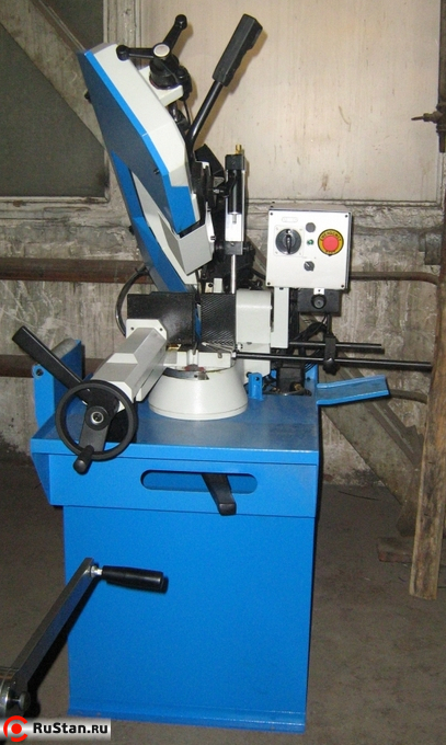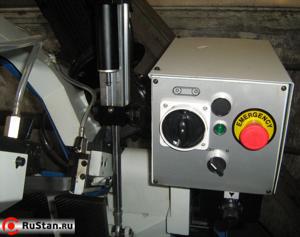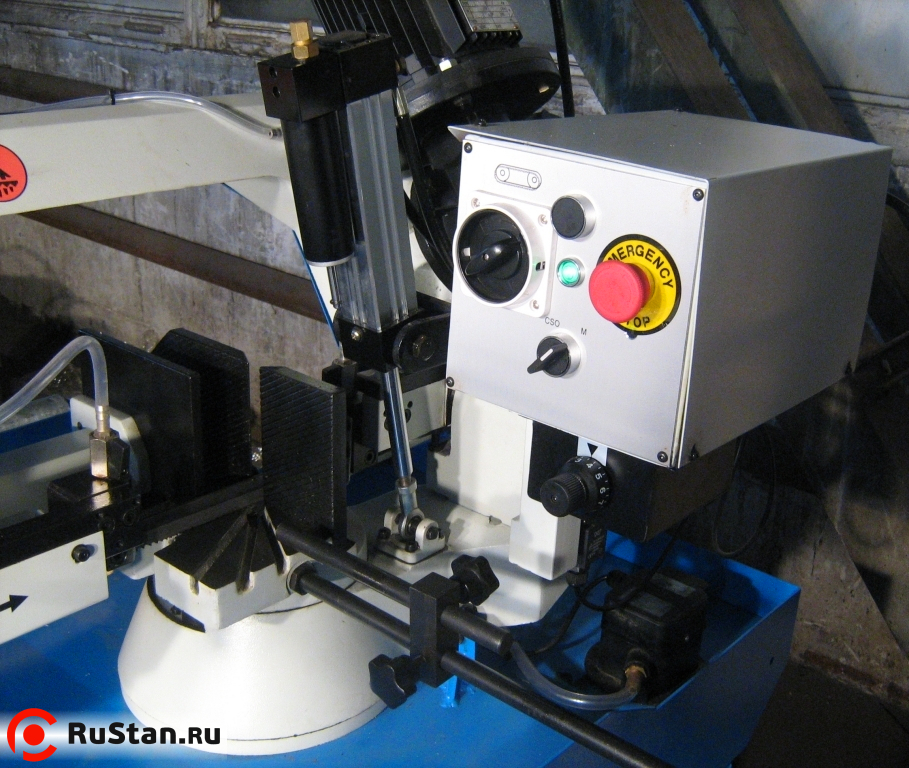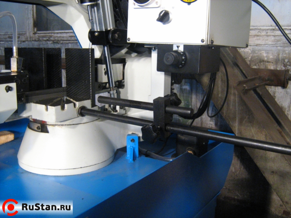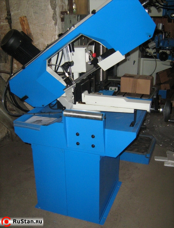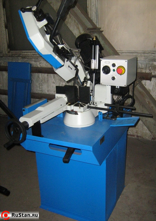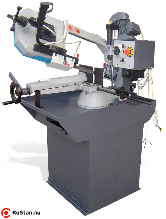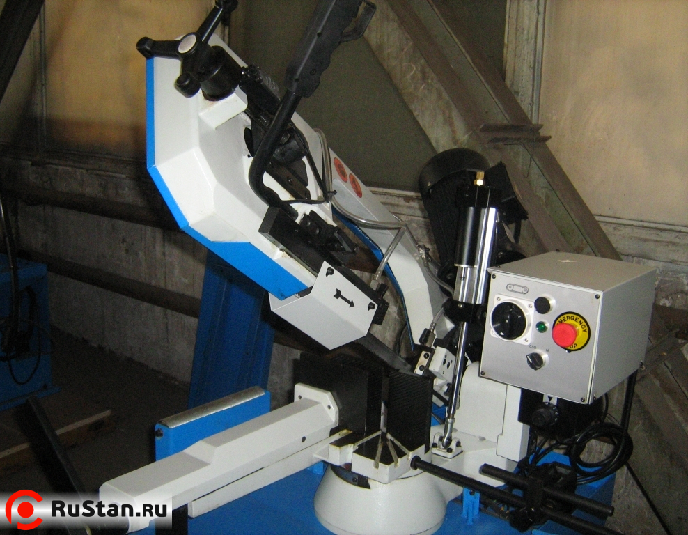 Станок ленточнопильный имеет систему механического натяжения полотна, соединенную с контроллером разрыва. Полотно протягивается в направляющих из твердых сплавов, повышающих точность резки. Вылет направляющей регулируется и фиксирует положение пильного полотна по размеру заготовки.