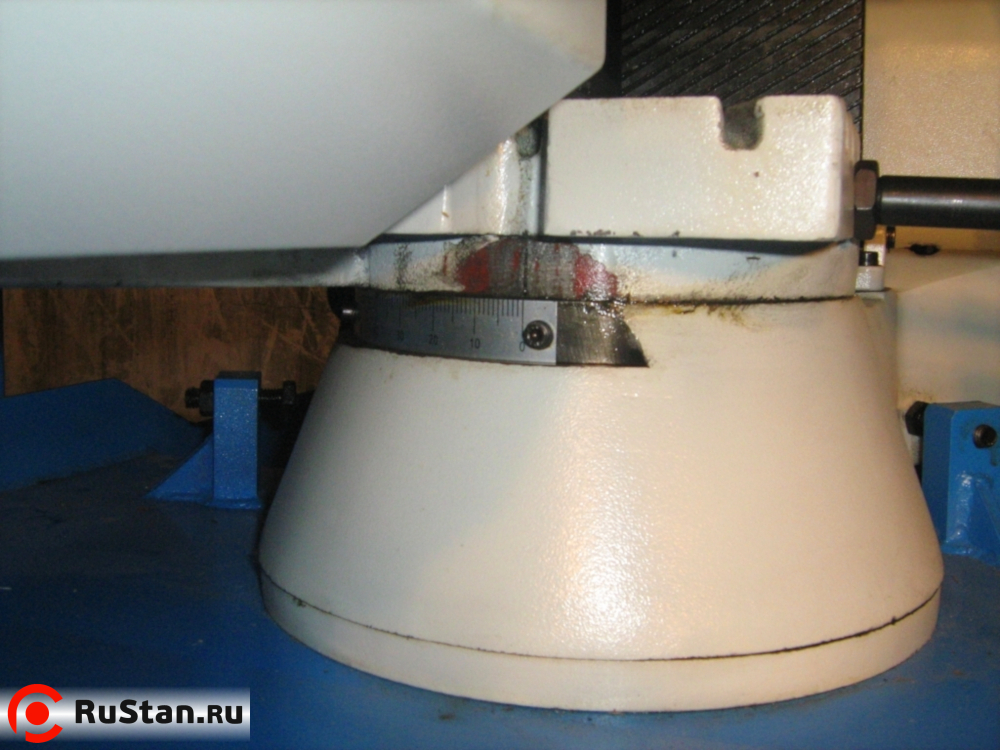 Пильная рама может поворачиваться вправо на 60 градусов для углового распила. Поворот пилы фиксируется рычагом на тумбе. Угол поворота пилы можно проследить по угломерной линейке. Тиски имеют пропилы напротив стандартных углов поворота.