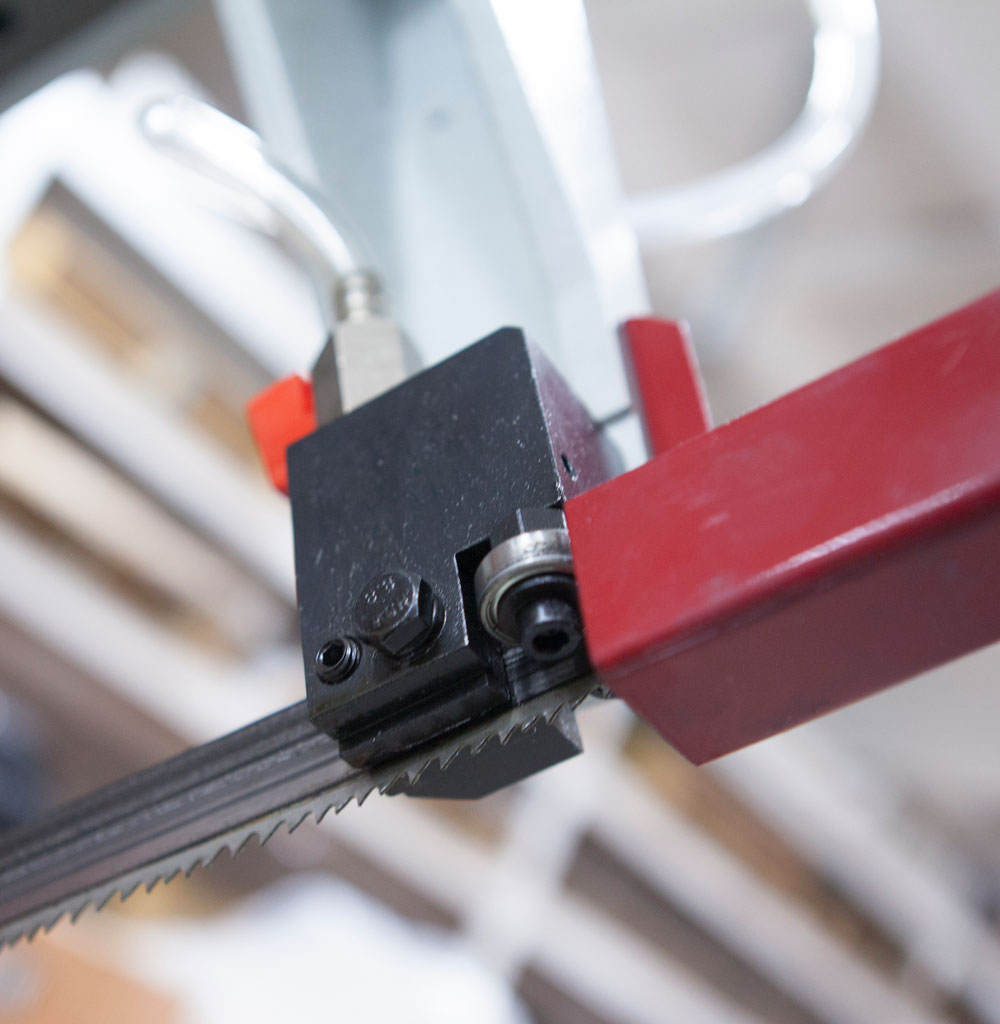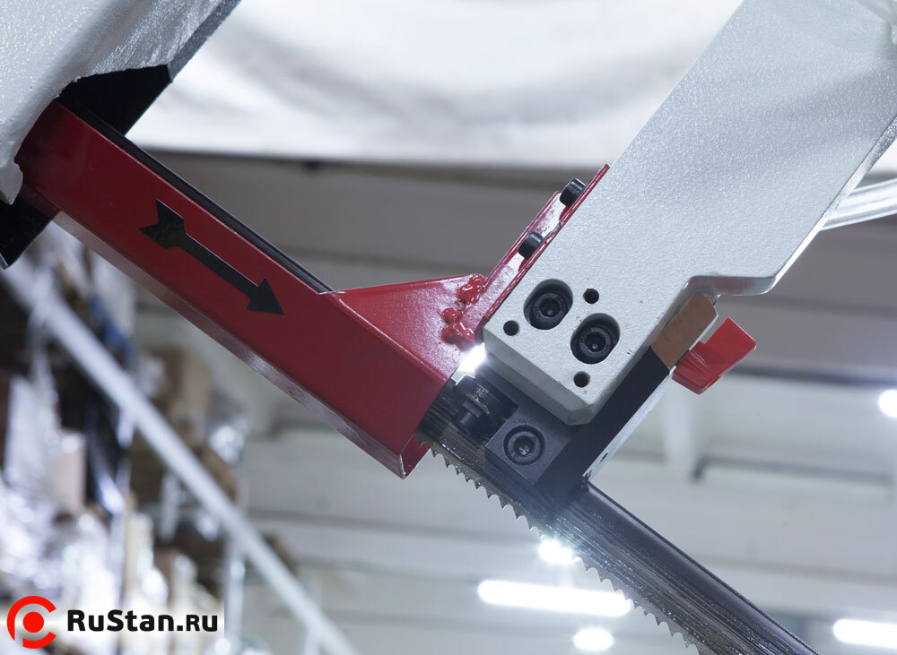 Подвижная направляющая и зубчатый блок, с твёрдосплавными платинами и подшипниками для выпрямления полотна в зоне резания и качественной фиксации для стабильного пиления. Гибкая трубка СОЖ с регулятором напора (фото №2).