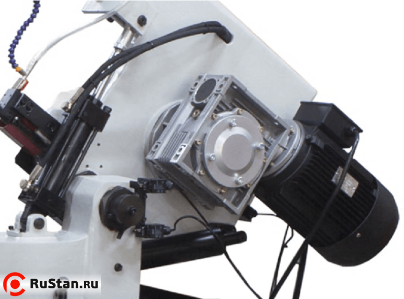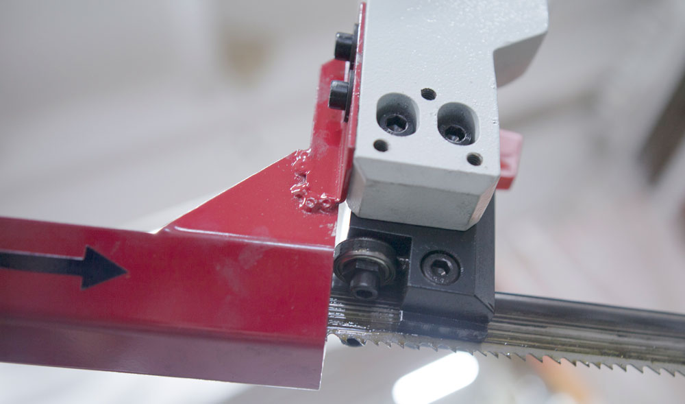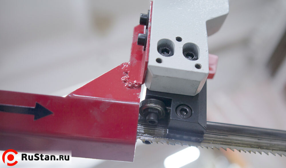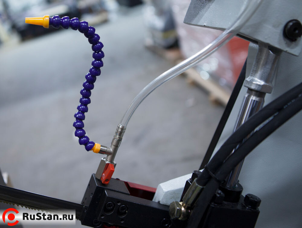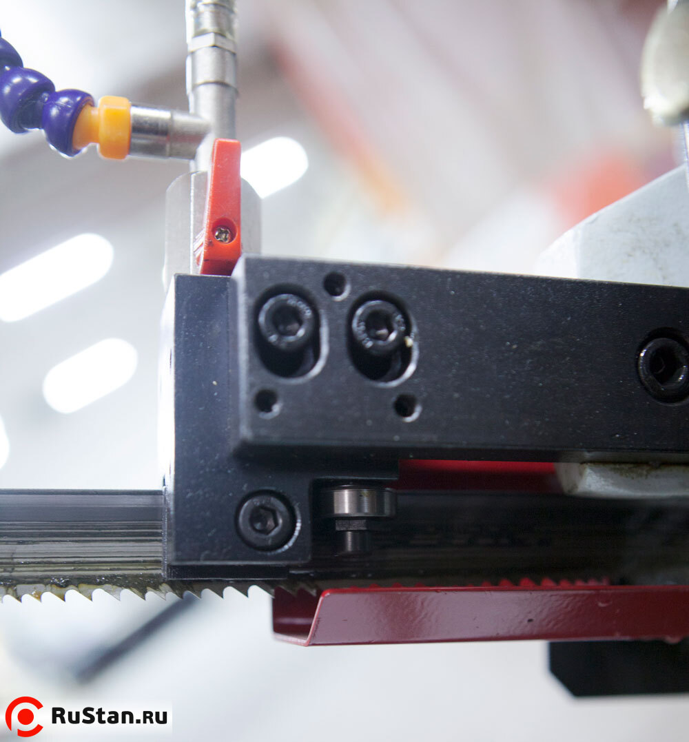 Подвижная направляющая и зубчатый блок, с твёрдосплавными платинами и подшипниками для выпрямления полотна в зоне резания и качественной фиксации для стабильного пиления. Гибкая трубка СОЖ с регулятором напора (фото №1).