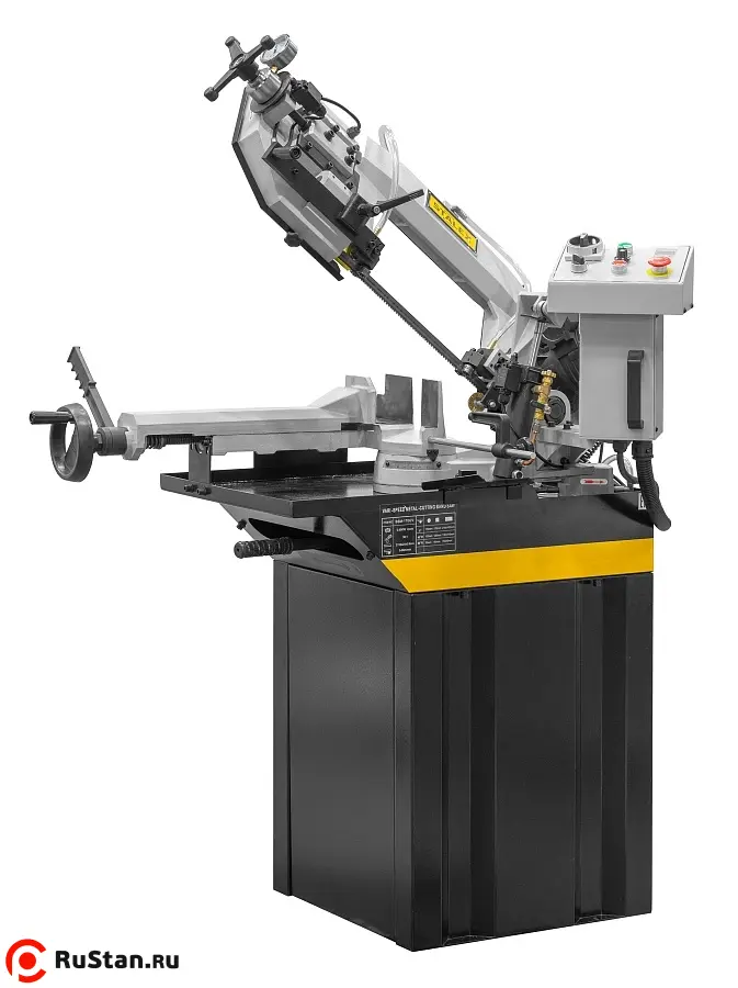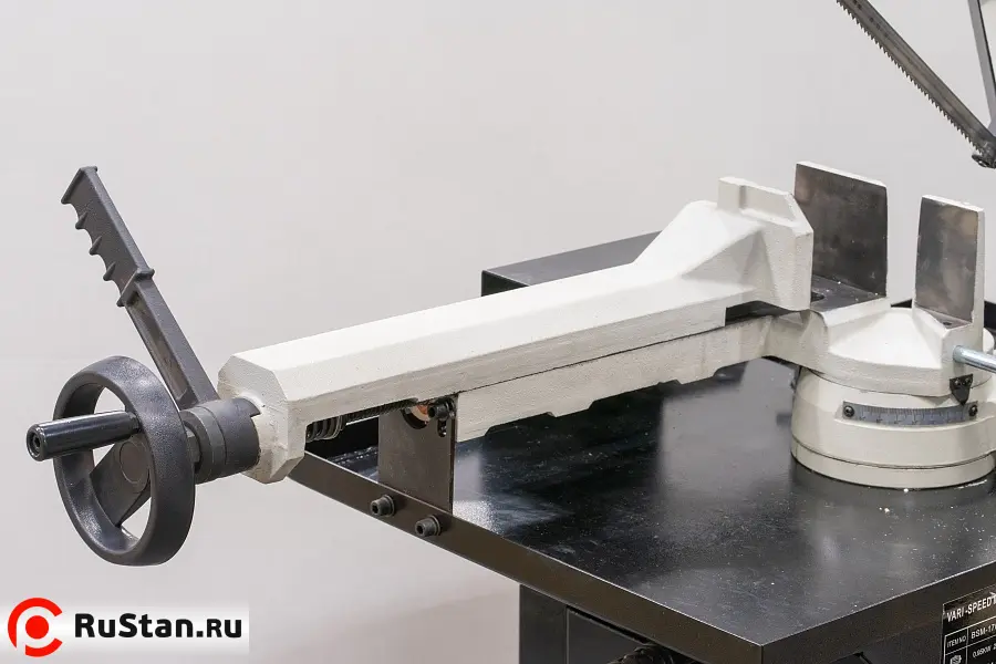Модель имеет быстрорегулируемые тиски для резки под углом, поворачивается рама, а не заготовка. Тиски с системой быстрого отвода ускоряют процесс смены заготовки (ускоренный отвод подвижной губки происходит без вращения маховика). Зажим заготовки осуществляется тисками вручную, подача заготовки - также вручную. Наличие системы СОЖ в стандартной комплектации – позволяет добиться высокой производительности.