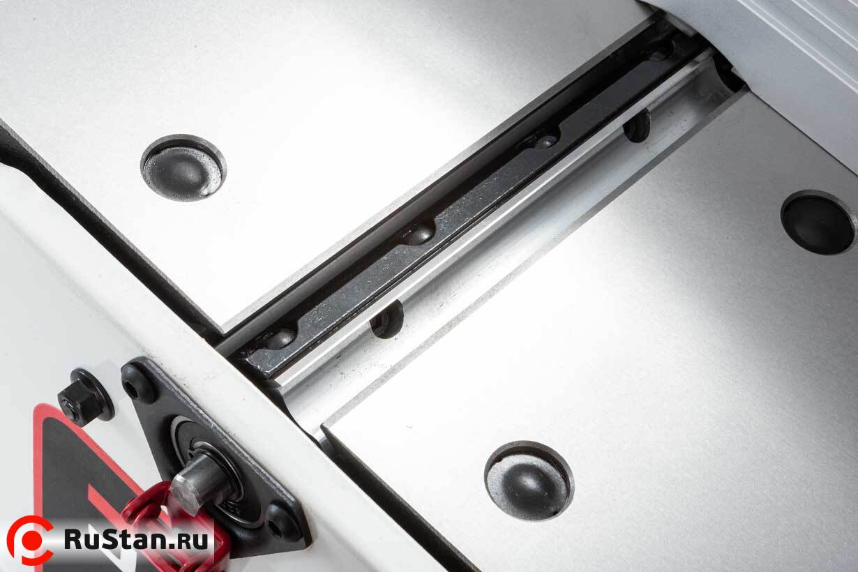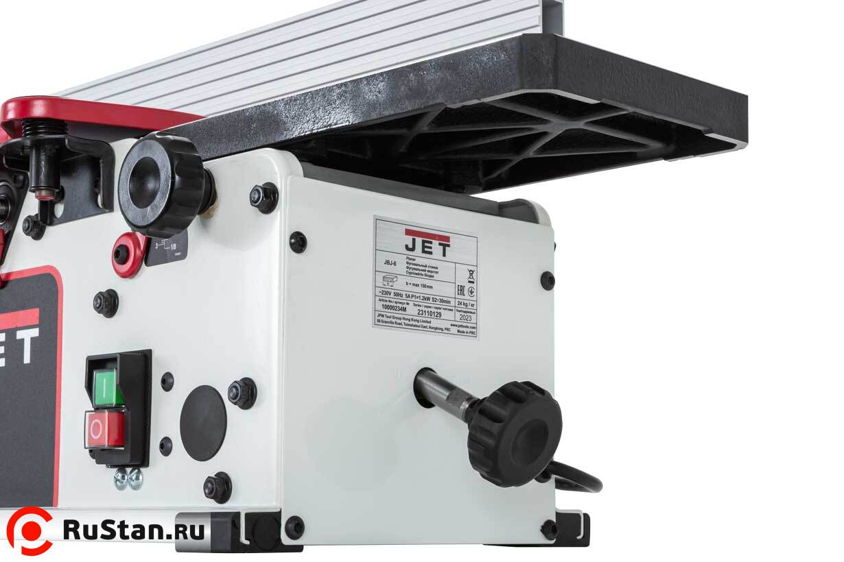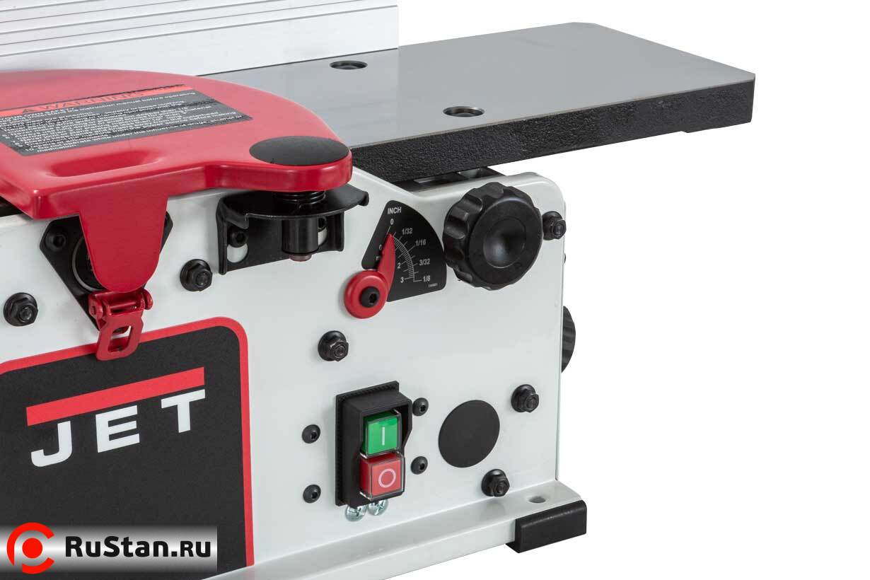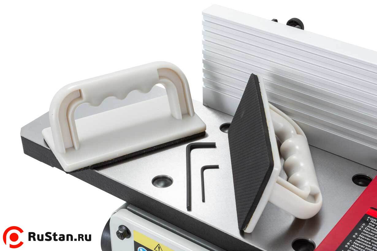 Как и у старших моделей, появилась возможность регулировки подающего и принимающего столов. И не только по высоте, но и по плоскости. А параллельный упор, изготовленный из экструдированного алюминия, имеет небольшой вылет и дополнительно может быть зафиксирован опционально поставляемыми кронштейнами для усиления жёсткости при фуговании тяжёлых длинных заготовок.
