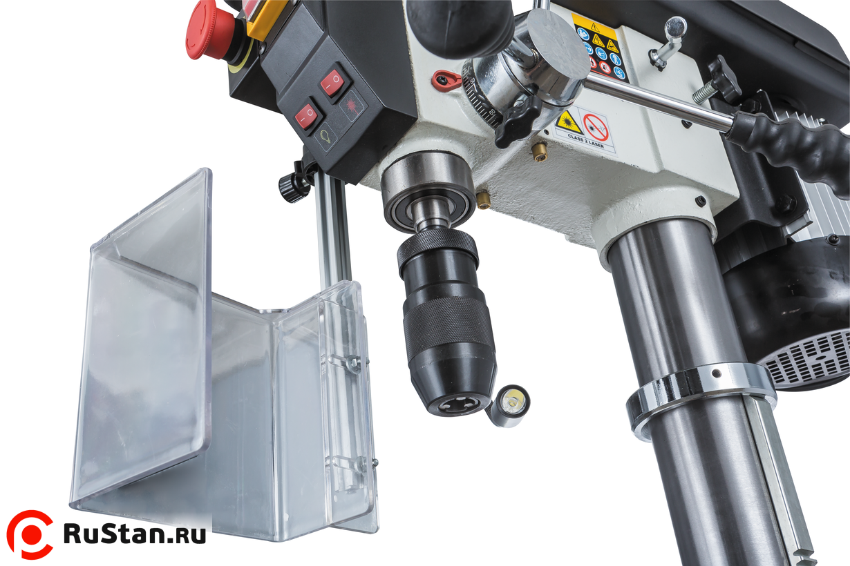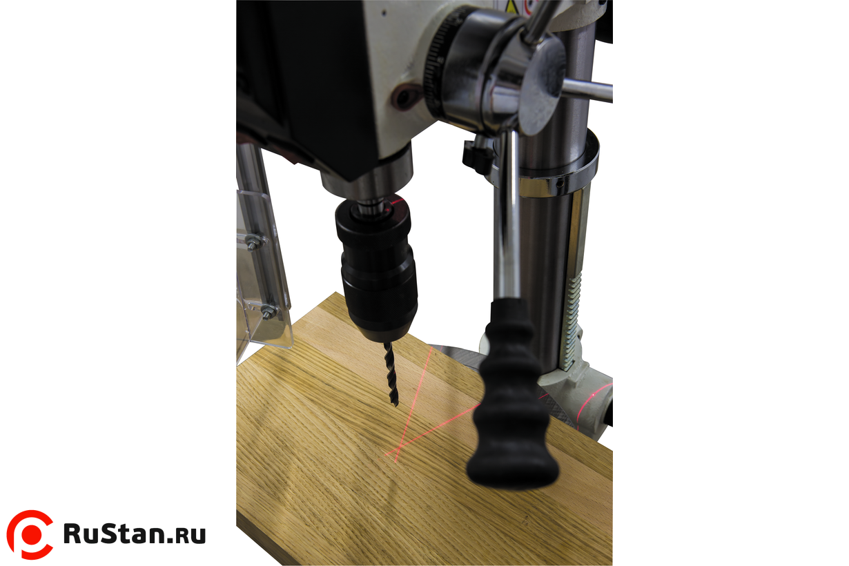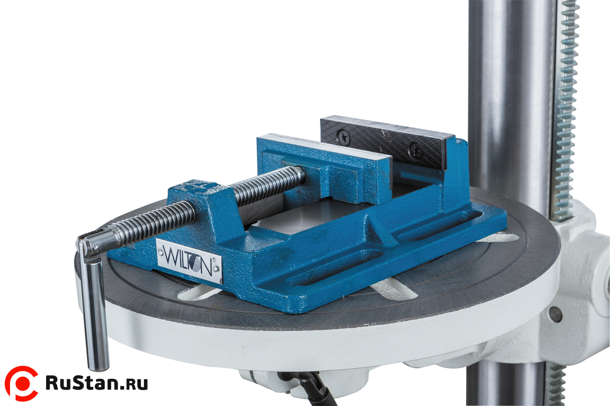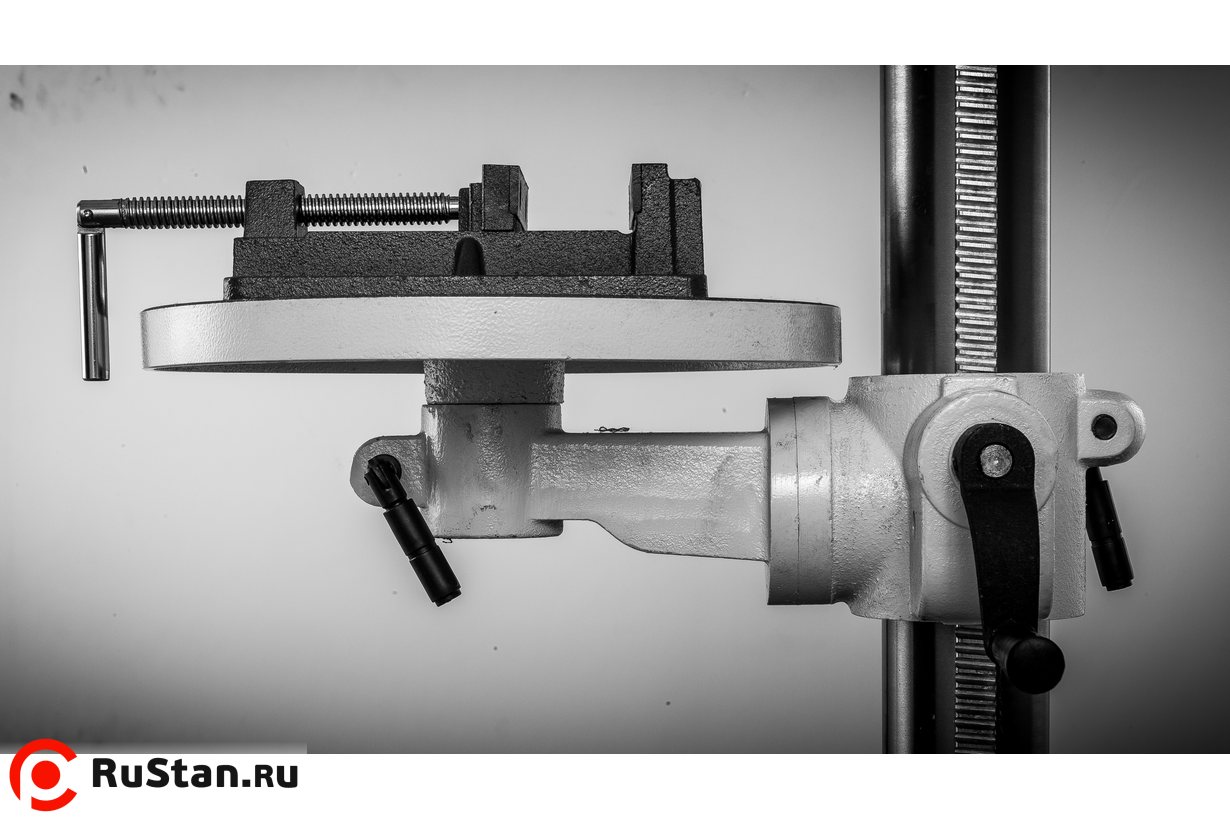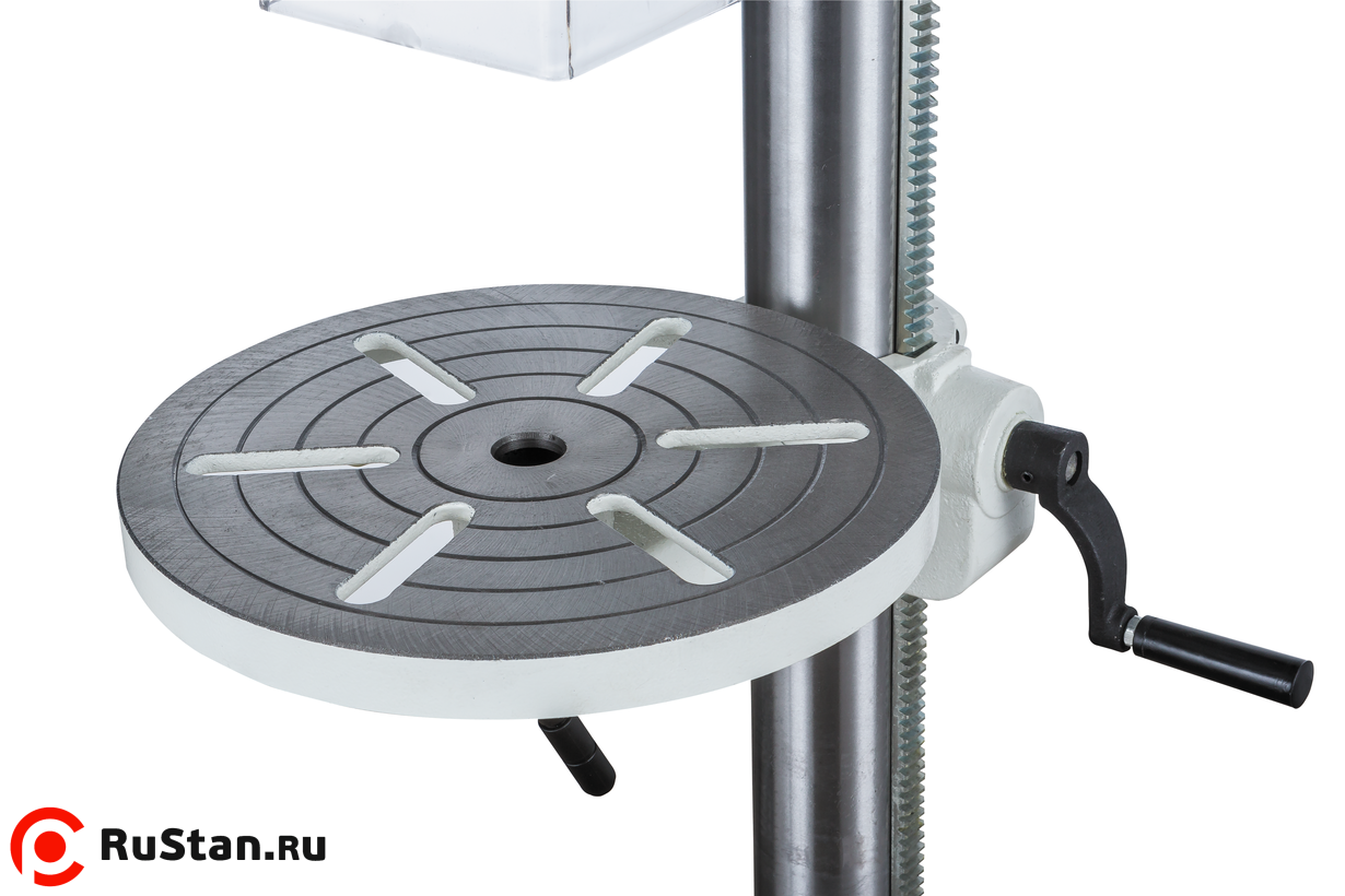 Массивный чугунный стол круглой формы имеет радиальные прорези для установки тисков (поставляются в комплекте) и может вращаться вокруг своей оси. Поворотный кронштейн обеспечивает наклон в обе стороны для сверления под углом и регулируется по высоте при помощи зубчато-реечного механизма. Рабочая область с прорезями есть и на основании станка, что позволяет работать от него, в этом случае расстояние до шпинделя будет достигать 1244 мм. Колонна, кронштейны, стол и прочие образующие конструкцию детали выполнены массивно и прочно, с расчетом на большие усилия при подаче сверла.