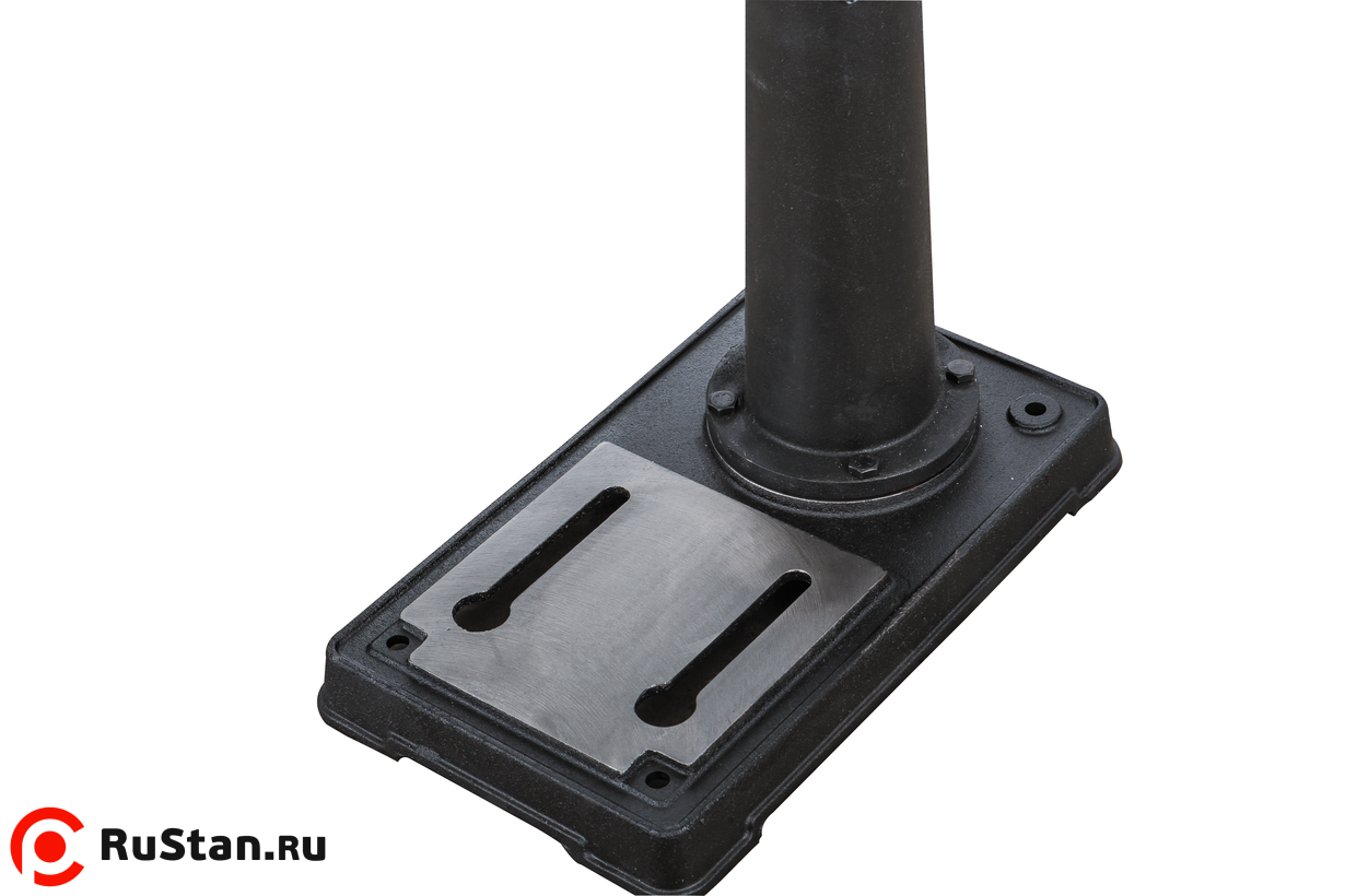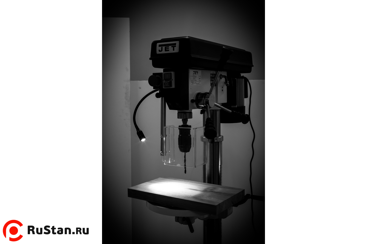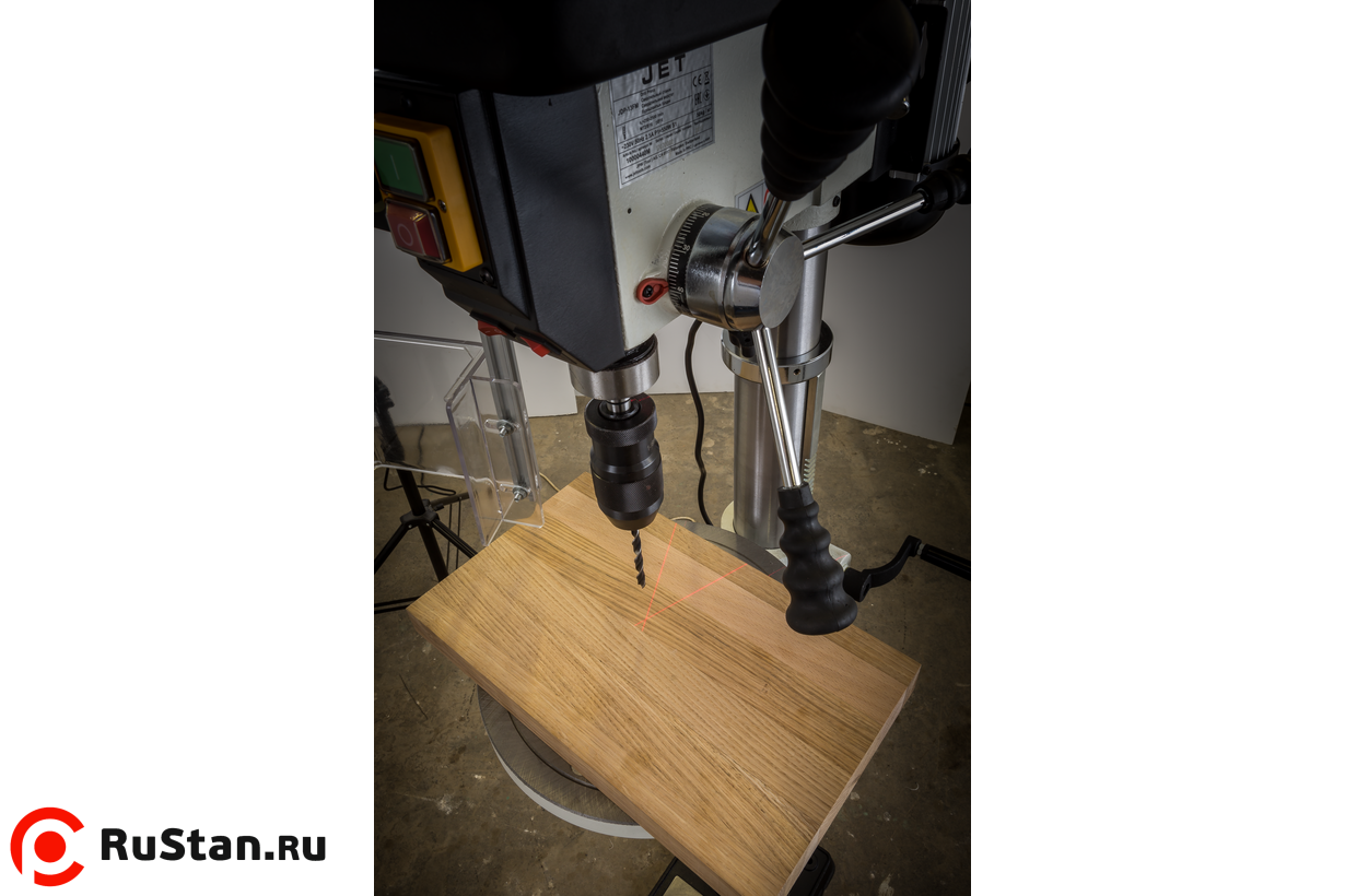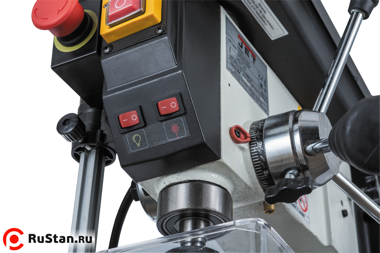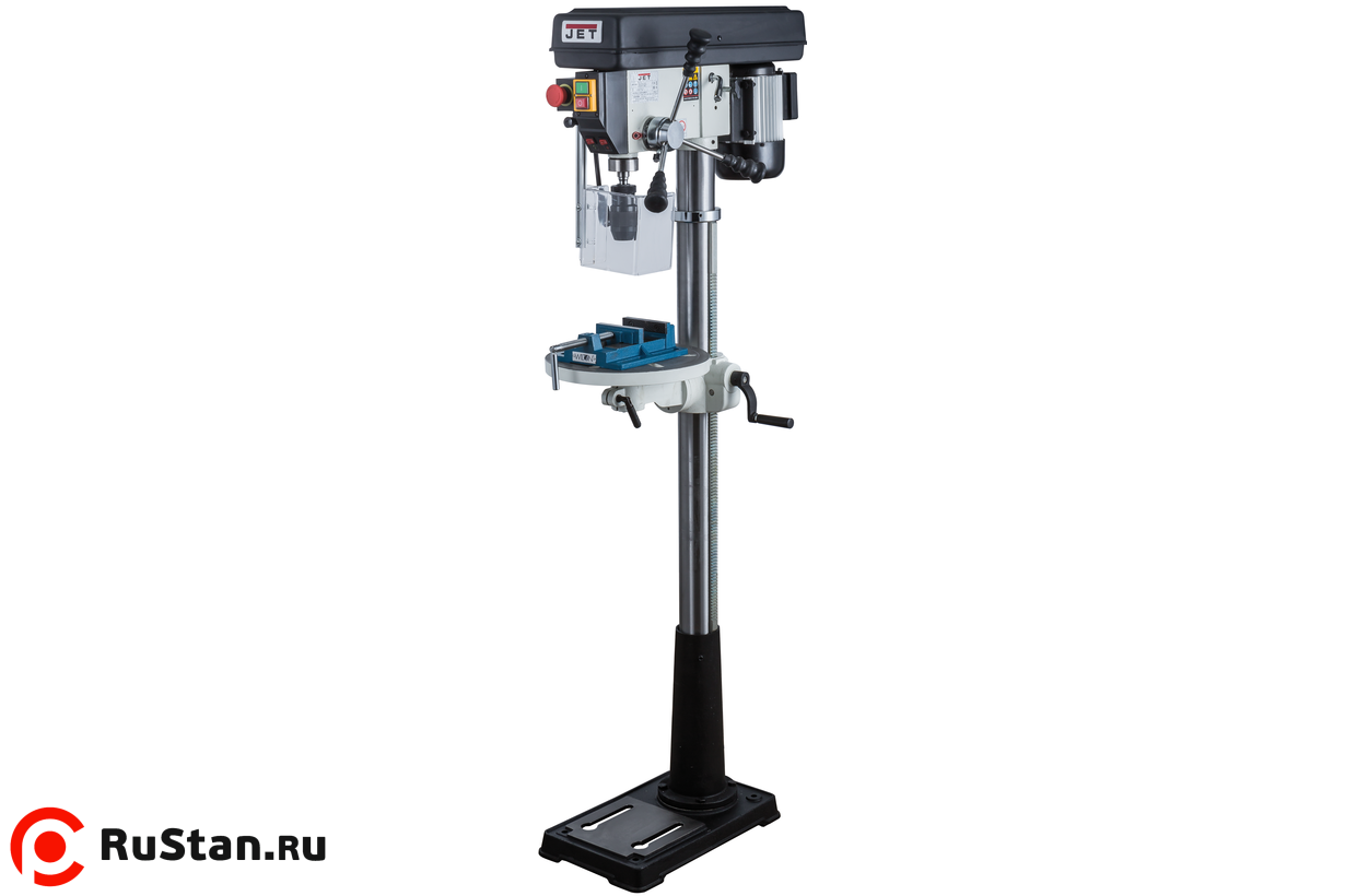 Массивный чугунный стол круглой формы имеет радиальные прорези для установки тисков (поставляются в комплекте) и может вращаться вокруг своей оси. Поворотный кронштейн обеспечивает наклон в обе стороны для сверления под углом и регулируется по высоте при помощи зубчато-реечного механизма. Рабочая область с прорезями есть и на основании станка, что позволяет работать от него, в этом случае расстояние до шпинделя будет достигать 1244 мм. Колонна, кронштейны, стол и прочие образующие конструкцию детали выполнены массивно и прочно, с расчетом на большие усилия при подаче сверла.