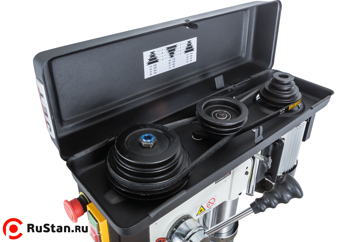 Ход пиноли контролируют по лимбу, совмещенному с регулируемым концевым ограничителем. Стандартный, поставляемый в комплекте, патрон – быстрозажимной, стандарт его посадки на оправку В16, отверстие шпинделя – под конус МК-2. Привод от мотора производится через двухступенчатую (с промежуточным шкивом) ременную передачу, которая позволяет выбрать одну из 12 скоростей.