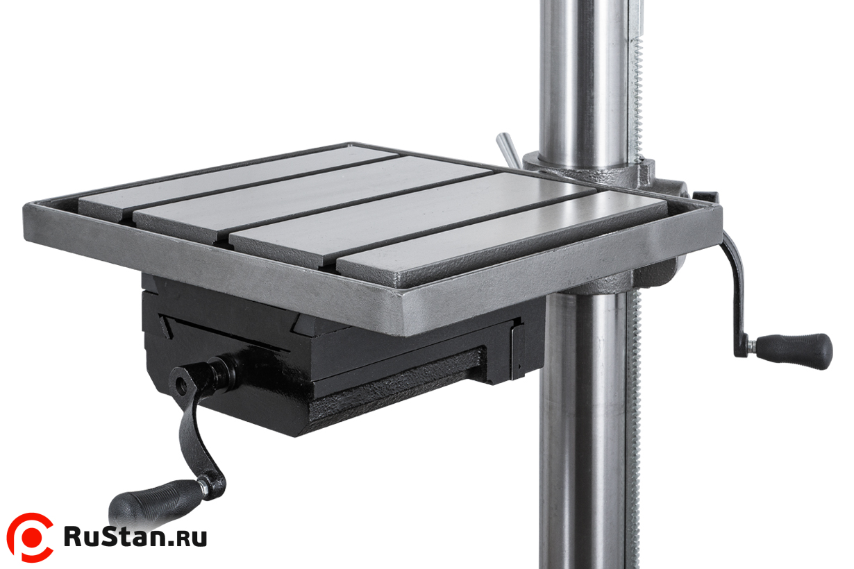 Станок имеет чугунное основание размером 580 х 430мм, в котором предусмотрены 2-Т образных паза для закрепления заготовки прихватами или другими зажимными приспособлениями. На основание установлена толстостенная колонна с зубчатой рейкой для возможности перемещения стола по вертикали. Рабочий стол, как и основание, изготовлен из качественного чугуна, его размер 455 x 405мм с 3-мя Т-образными пазами шириной 14мм.