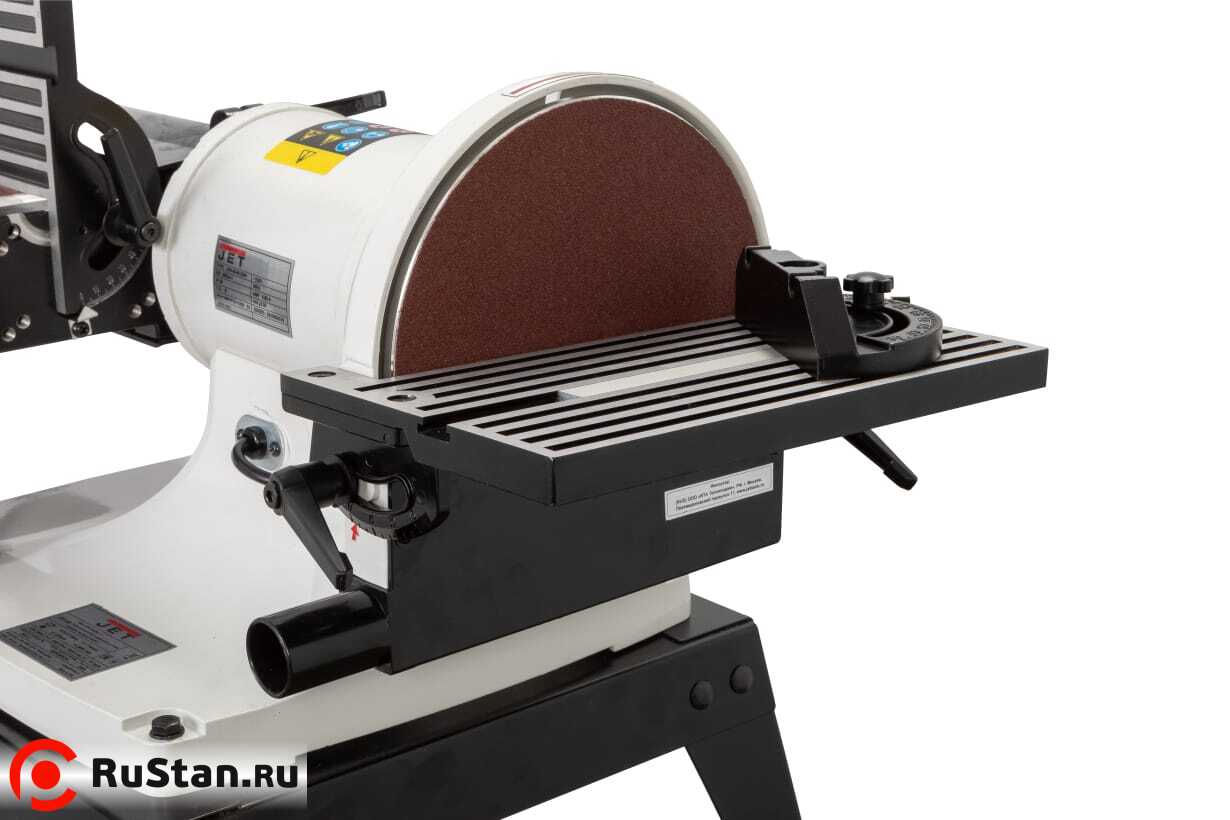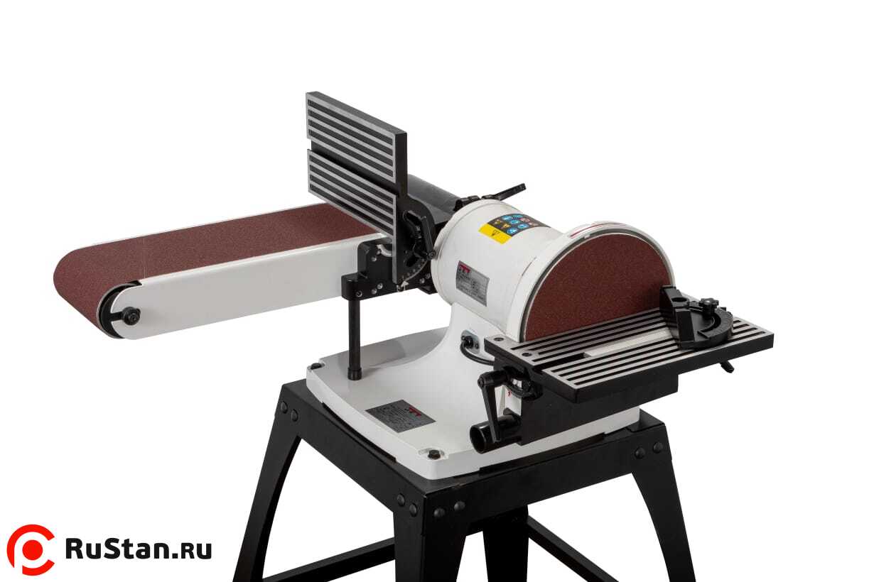 В отличии от совсем бюджетных моделей, станок оборудован отдельными столами для обоих узлов. Не потребуется переставлять стол с диска к ленте и обратно. Все и всегда будет готово к использованию. Оба стола можно использовать под углами к абразиву. Угол наклона столов легко меняется. При чем, на ленточной стороне стол не нужно снимать, когда меняете положение самого узла.