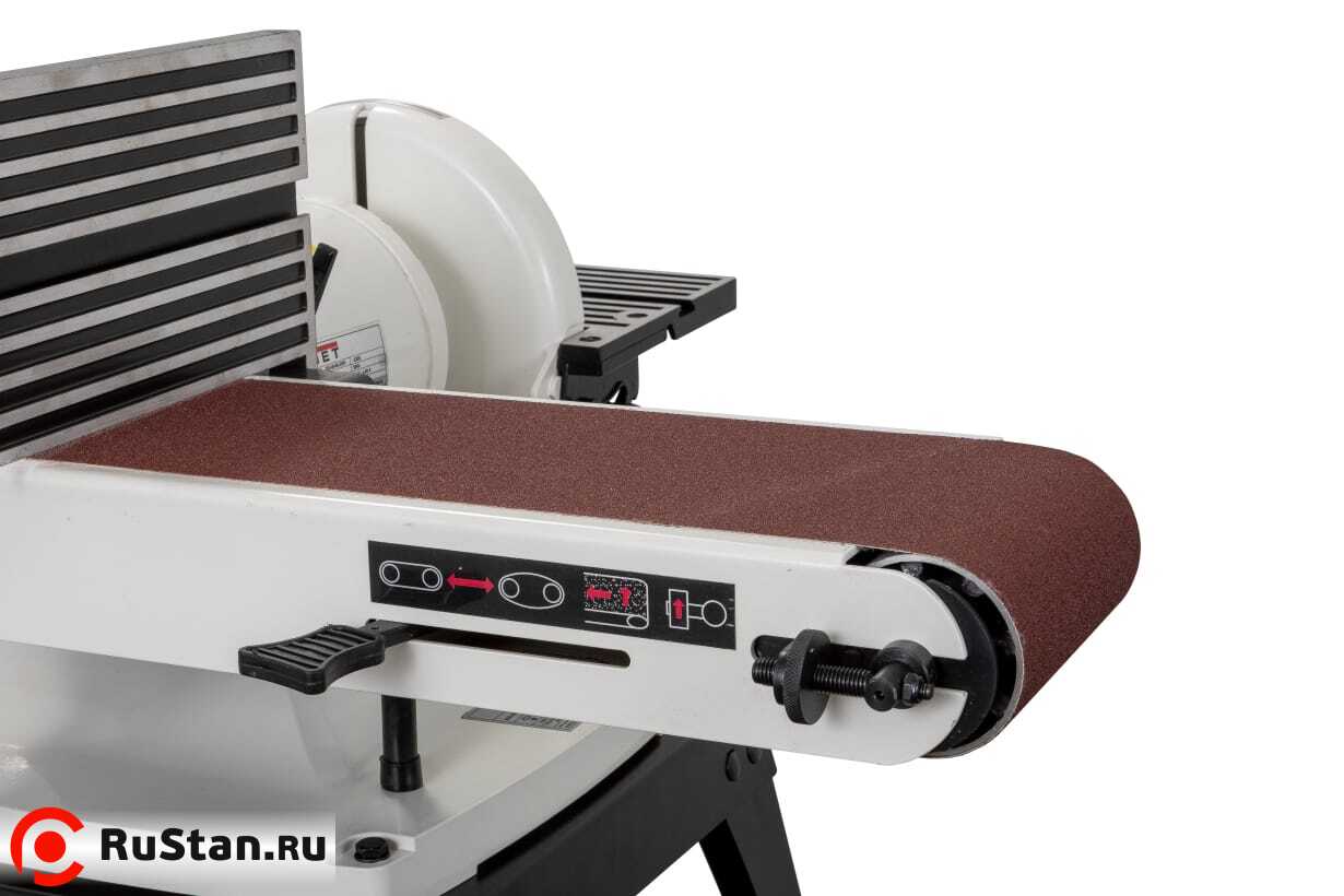 Это упростит смену шлифматериала. На ленточной стороне, в случае очень интенсивного использования, можно установить графитовую подложку. И одно и другое несложно поменять на новые, когда износятся. Станок создан для несложных, не слишком нагрузочных работ. Будет незаменим в небольших мастерских, столярных или слесарных. Можно разместить на верстаке или на открытой, стальной, напольной подставке, входящей в стандартный комплект поставки.
