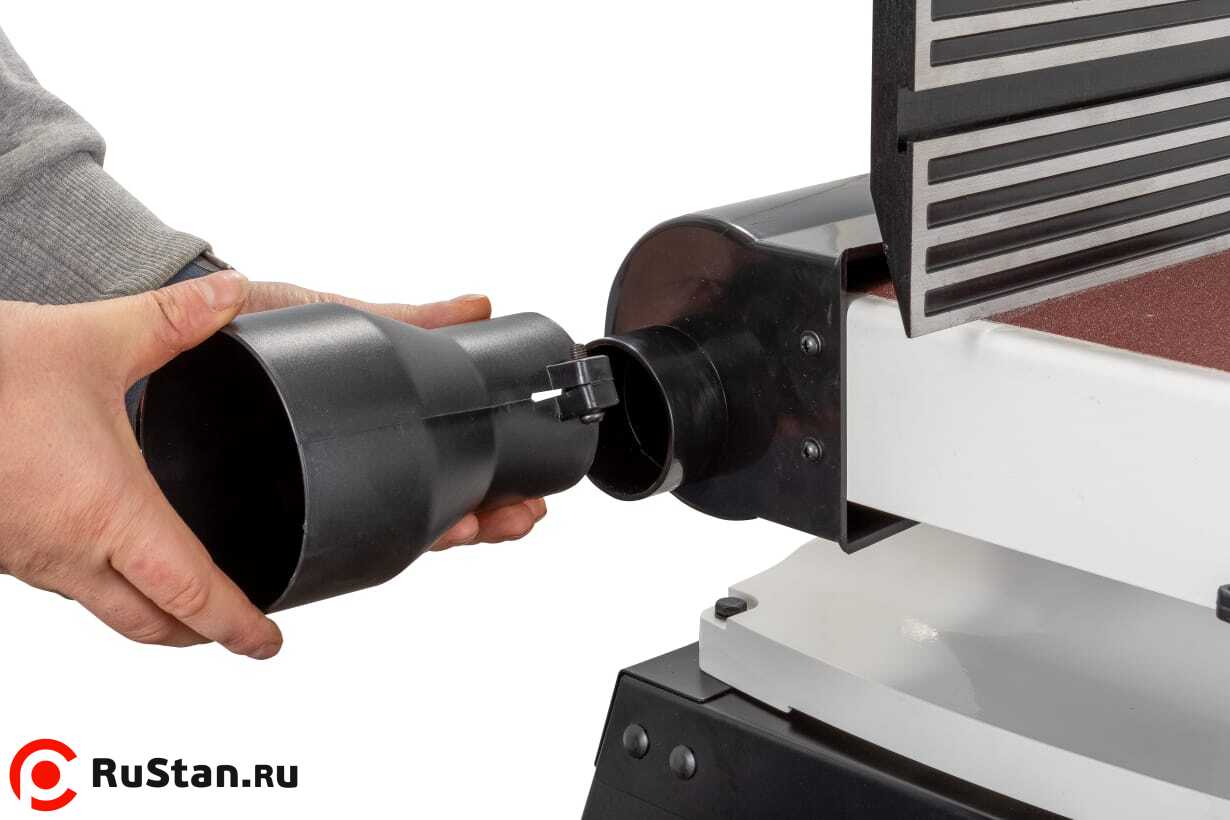 Отведение пыли из зоны обработки происходит самостоятельно под действием движения диска и ленты. Для беспыльной работы станок требуется подключить к системе пылеудаления или пылесосу.