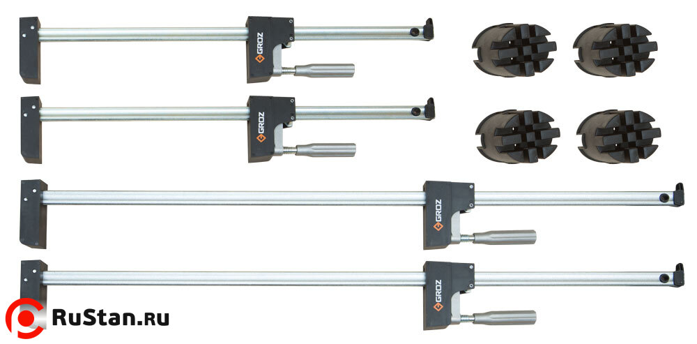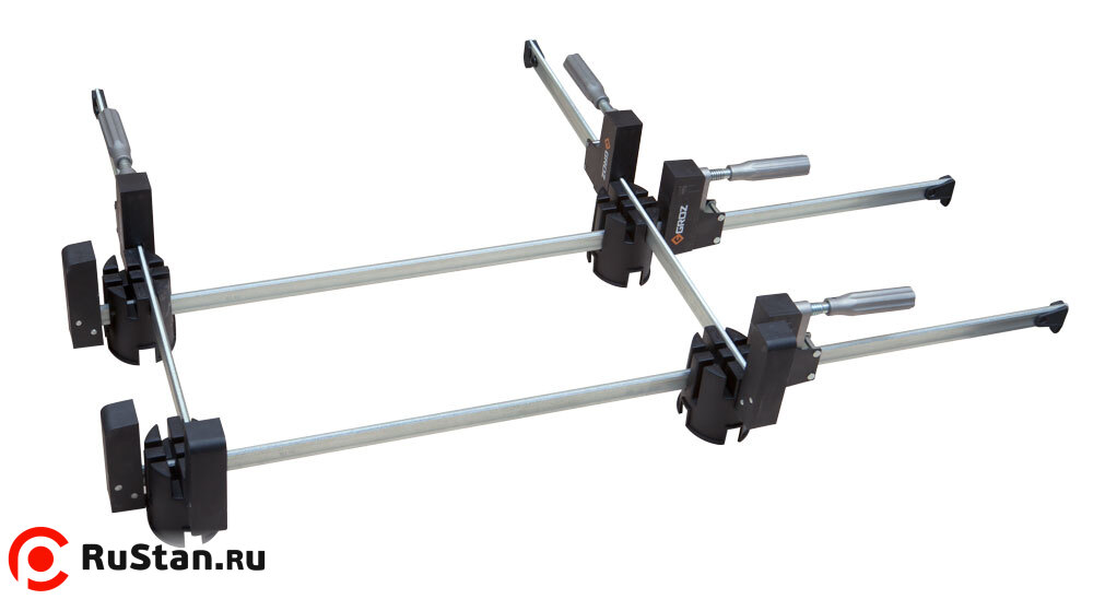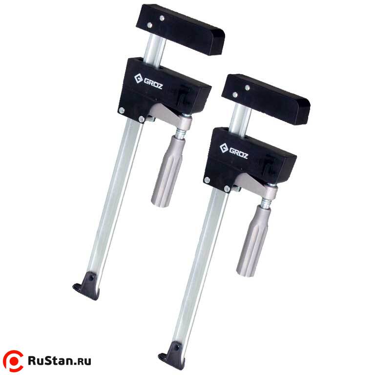 Классические F-образные струбцины с направляющей из высококачественной профилированной стали с насечками для фиксации подвижной части зажима. Стальные губки расположены в защитных пластиковых корпусах. Усилие сжатия – до 2500 кН.