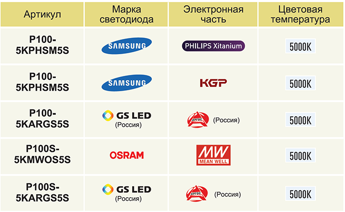 • Светодиоды Samsung; (обратите внимание на модель светильника)