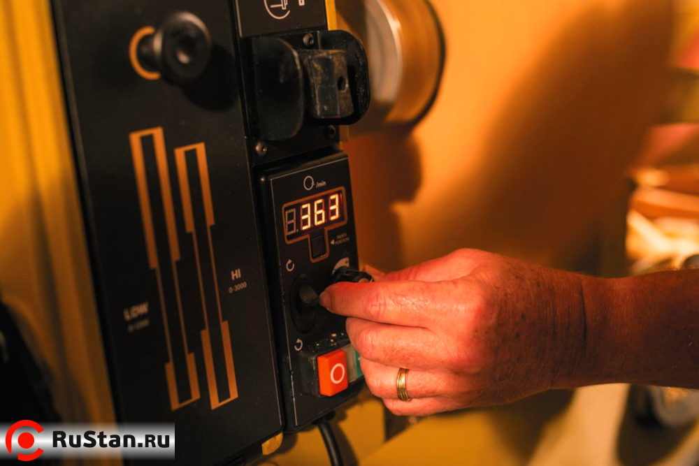 Станок подключается к однофазной сети 220В, но имеет встроенный частотный преобразователь и, соответственно, трехфазный асинхронный двигатель. Электроника позволяет в широком диапазоне изменять скорость вращения шпинделя, обеспечивая при этом одинаково высокий крутящий момент. Частота оборотов задается небольшой поворотной рукояткой и, для удобства настройки, отображается в цифровом виде на символьном дисплее. Вспомогательная функция блока – изменение направления вращения простым переключателем. Для удобства управления пульт сделан выносным с магнитной фиксацией – его можно разместить в любом месте, где это будет удобно оператору.